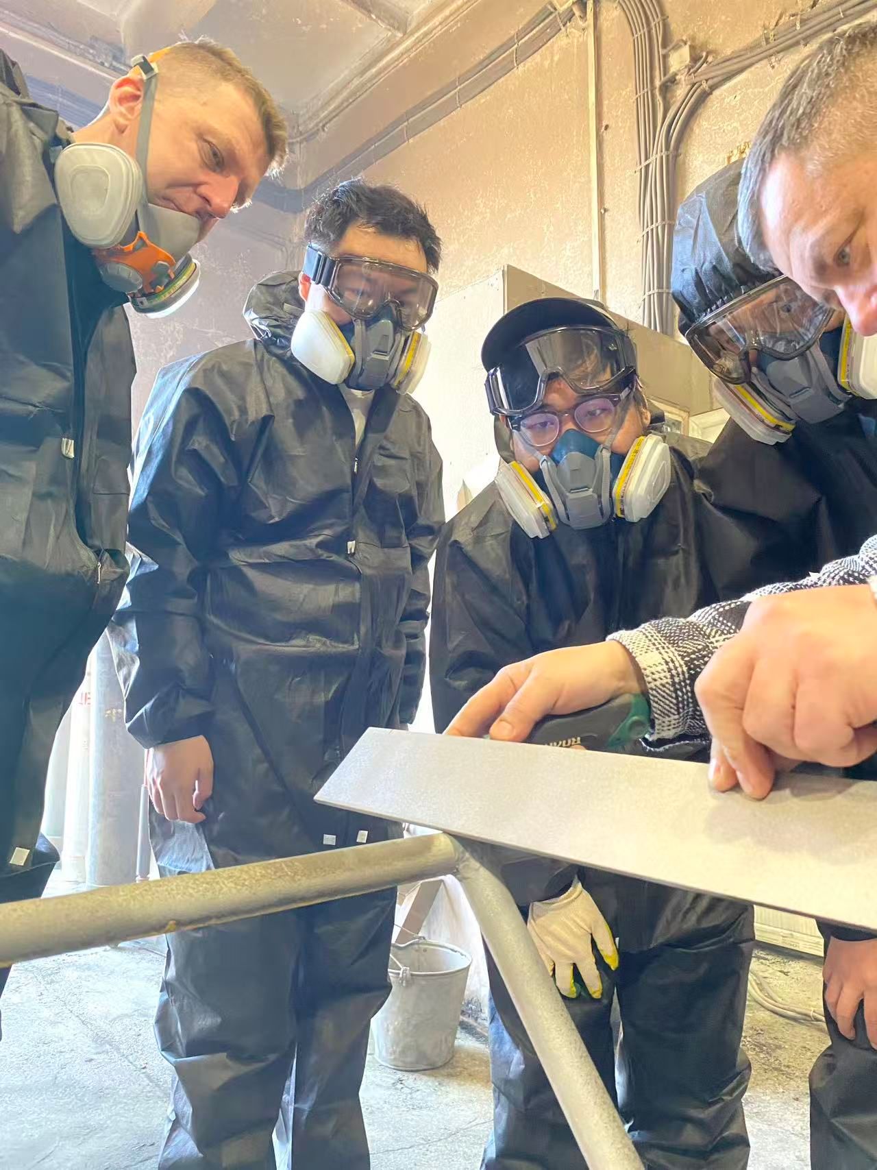 在企业工程现场,副校长Grigoriy V. Piyatrishin与企业技术专家共同为同学们讲解防护涂层技术的工业应用场景与全流程作业规范。同学们身着专业防护装备,全程观摩火焰喷涂等核心工艺操作,观摩金属基材在高温喷涂下形成致密防护层的全过程,直观感受自动化控制技术在涂层厚度调节、工艺参数稳定等环节的关键作用。在样品检测区,同学们跟随技术人员学习涂层性能检测方法,围绕自动化控制与涂层质量管控的交叉应用展开深入交流,将课堂理论知识与产业实际需求紧密结合。